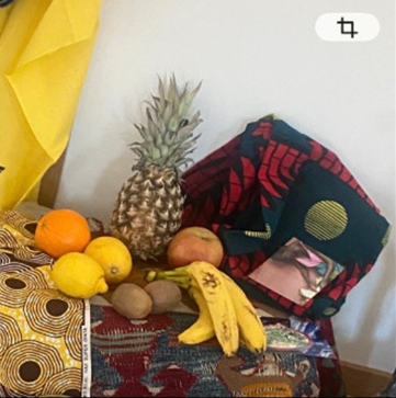 Eine Fülle von authentischen Dekorationen, viele Stoffe, Schmuck, Wanderstab, Fotos, mitgebracht aus Nigeria von Maria Weiß, wurde zusammen mit Margit Köpnick zu einem vielfältigen Kosmos gestaltet, die Einblick in ein fremdes Land gab, wie bunt und schön es sein könnte.