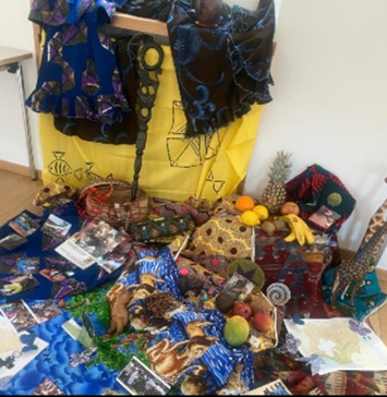 Eine Fülle von authentischen Dekorationen, viele Stoffe, Schmuck, Wanderstab, Fotos, mitgebracht aus Nigeria von Maria Weiß, wurde zusammen mit Margit Köpnick zu einem vielfältigen Kosmos gestaltet, die Einblick in ein fremdes Land gab, wie bunt und schön es sein könnte.