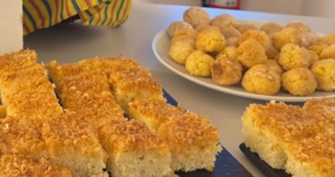 Nun gab es die von den Damen des KDFB zubereiteten Köstlichkeiten, Kokosbällchen ShukaShuka, Kokoskuchenschnittchen, ein würziges rotes Reisgericht und spritzigfruchtigen Cocktail.