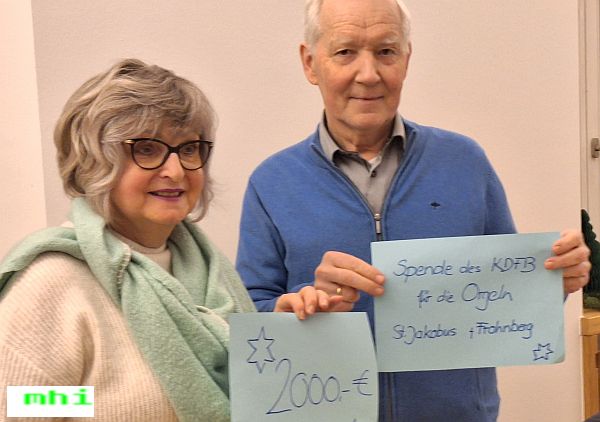 Dem „überglücklichen“ Kirchenpfleger Georg Münch überreichte Hildegard Gallitzendörfer für die Reparaturen an den Orgeln in der Pfarrkirche St. Jakobus und der Frohnberger Wallfahrtskirche insgesamt